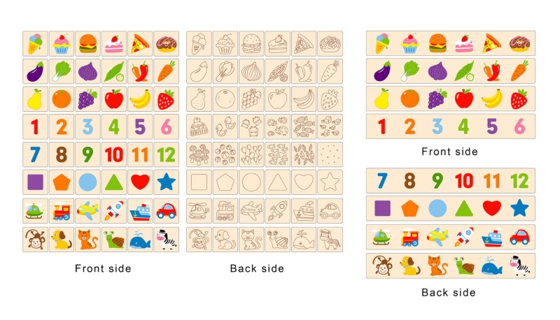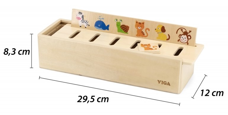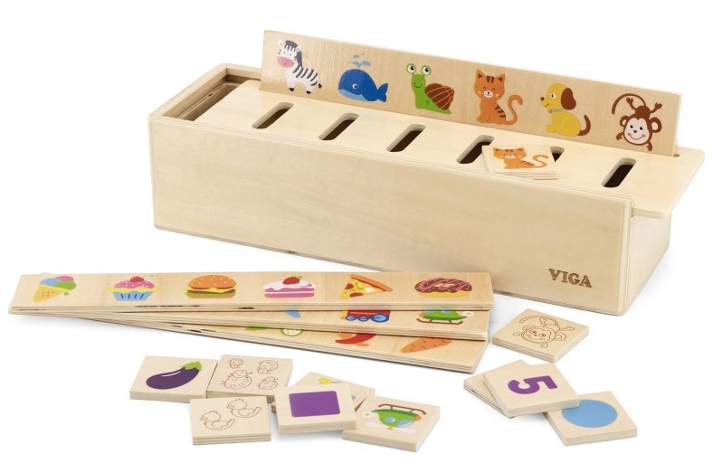 Една класическа игра за сортиране на предмети, с познавателна насоченост, която води до обогатяване на знанията и уменията на децата да групират. Докато играят те развиват логическо мислене, наблюдателност и отговорност. В горната част на кутията има капак с шест дупки, в които могат да се поставят една от четирите двустранни тематични плочки. Децата трябва да съчетаят 6 от 48 плочки, съответстващи на различните категории. В комплекта има седем категории: храна, зеленчуци, плодове, числа, форми, транспортни средства и животни. Благодарение на тази играчка детето развива ръчна сръчност и упражнява координация ръце и очи и въображение..