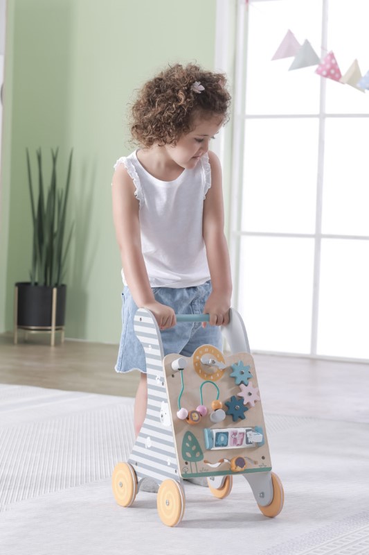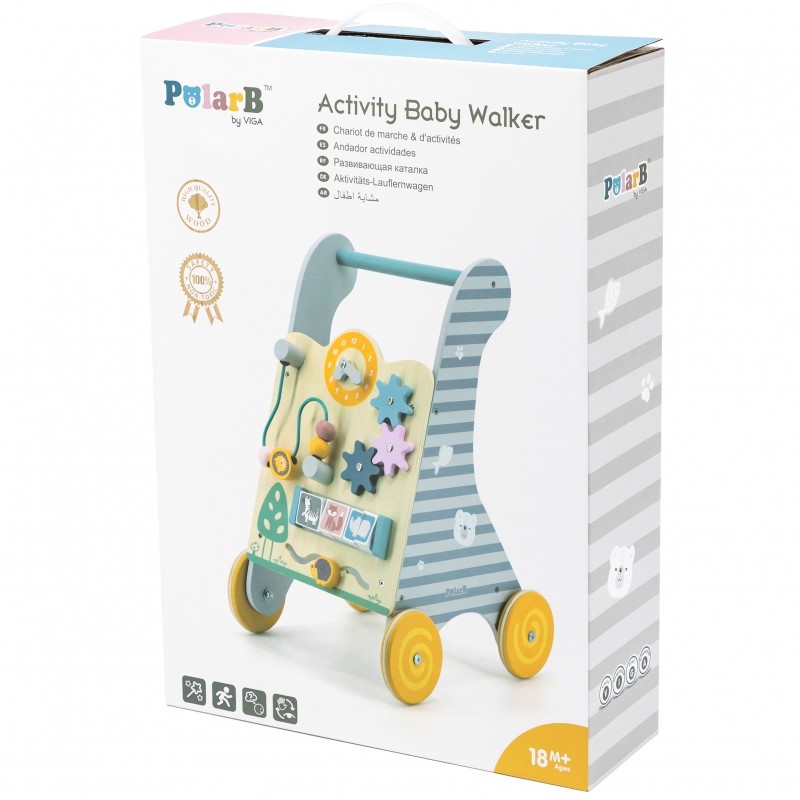 Всички тези игри не само ще са забавни, но и образователни. Оцветена с напълно безвредни за децата бои и мастила, в нежни пастелни цветове. Колелата на дървената проходилка с активности Polar B е със силиконови пръстени предпазващи от подхлъзване. Стабилна проходилка за бутане (Уолкър) направена изцяло от дърво, която е много приятна на допир и създава чувството за топлота. Може да помогне на всяко любознателно дете да достигне желаното място със стабилна опора.