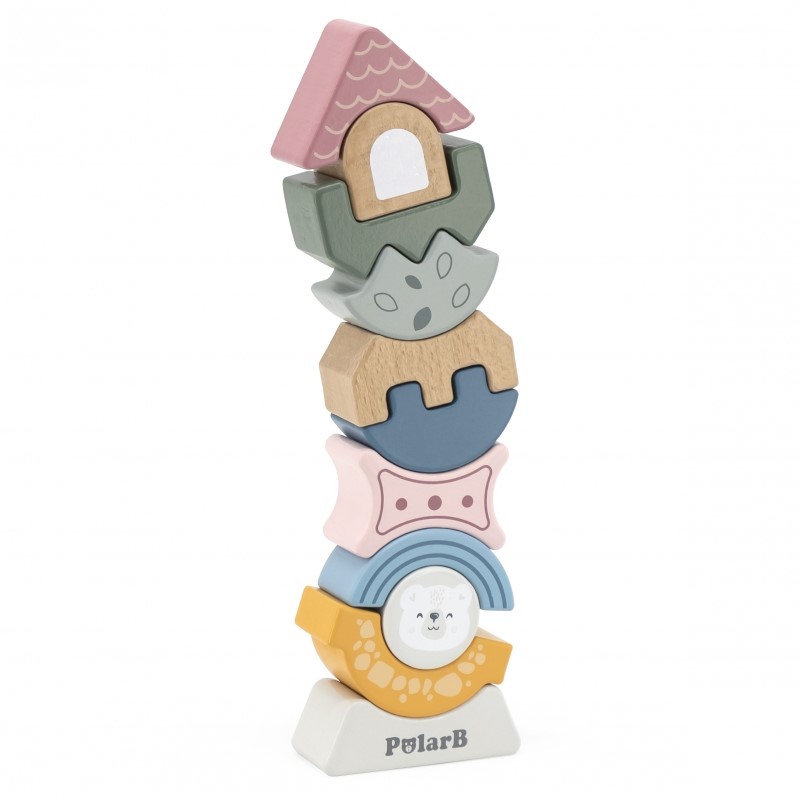 Дървената кула за баланс се състои от 11 цветни блокове с различни форми. Повечето парченца са изработени са в пастелни цветове, а някои са небоядисани. Детето трябва да сглоби пирамидата, така че да не се преобърне. Съпоставянето на блоковете един с друг и балансирането на сградата е интересна задача за децата. Тази дървена образователна играчка се отличава със заоблени елементи, изгладени ръбове и гладко шлайфана повърхност.