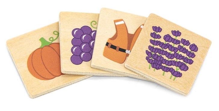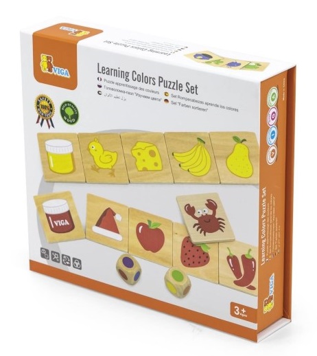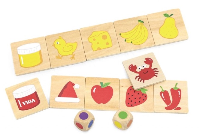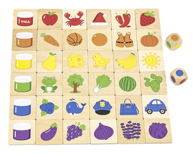 Комплектът включва 36 дървени плочки и 2 зара. Шест от тях са изрисувани с бурканчета с боя в шест цвята: червен, оранжев, жълт, зелен, син и лилав цвят. Останалите 30 плочки са с илюстрирани различни предмети в различни цветове. Докато играят децата развиват логическо мислене, наблюдателност и различаването на цветове и предмети.