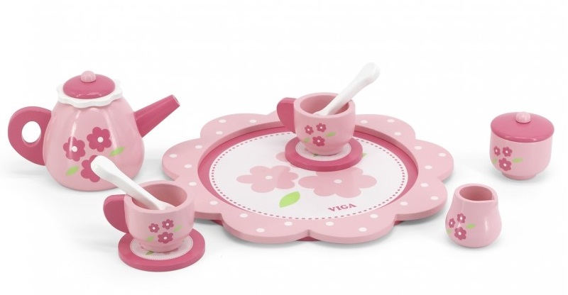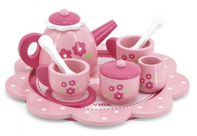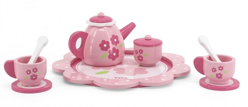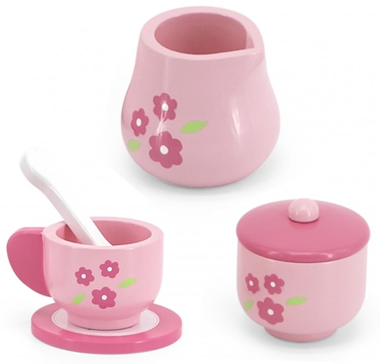 Поднесете чаша ароматен чай на своите кукли или приятели с този красиво изрисуван дървен сервиз съдържащ: поднос за сервиране, две чашки, две чинийки, чайник за вода, две чаени лъжички, кана за мляко и захарница. Този комплект ще осигури прекрасни забавления на децата. Те ще играят различни роли като – майки, сервитьори и други. Сервизът е изработен от букова дървесина и е боядисан с нетоксични бои в розово пастелни цветове, които ще привлекат вниманието на децата и ще ги насърчи да се забавляват.