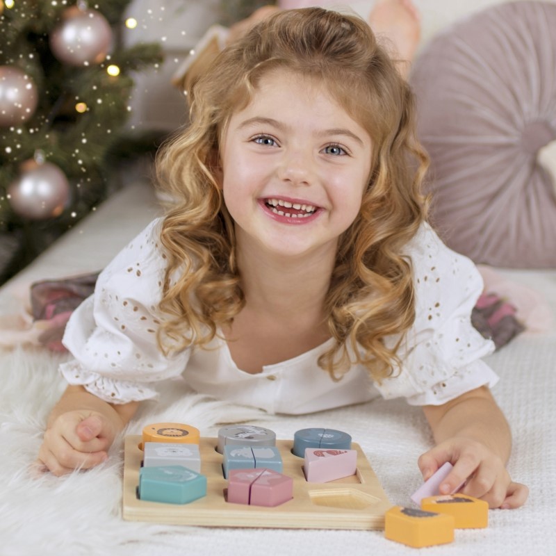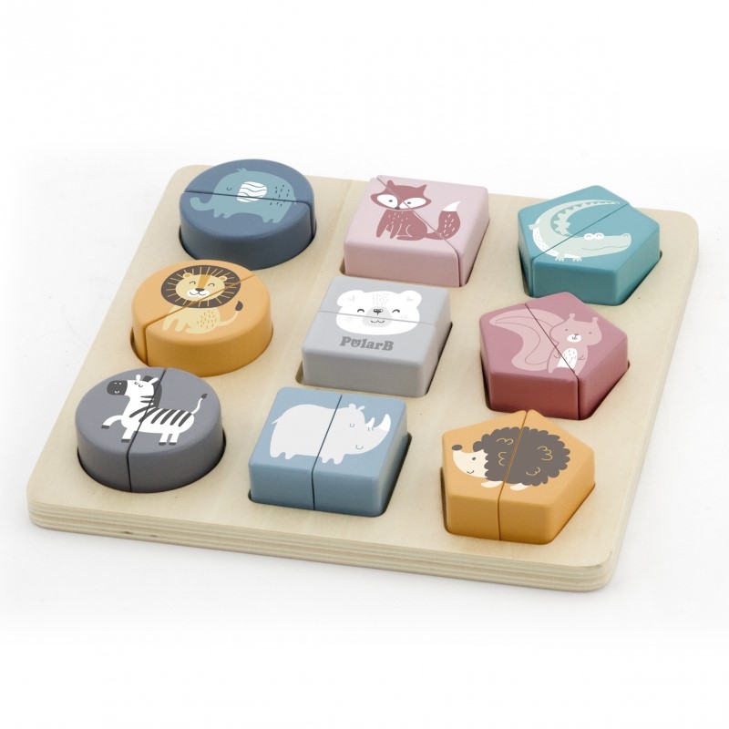 Пъзелът се състои от 18 нежно оцветени дървени блокчета. Те трябва да се съединят две по две и да образуват 9 картинки на различни животни в различни форми. Частите на пъзела са достатъчно големи за да бъдат лесно хванати от малките детски ръчички. С този детски пъзел децата научават няколко неща: