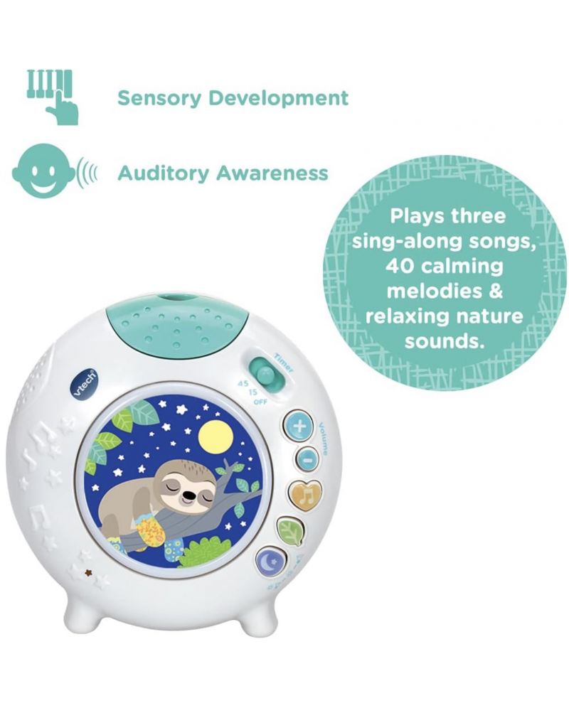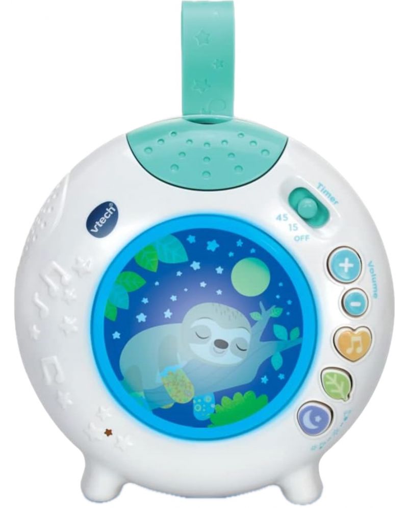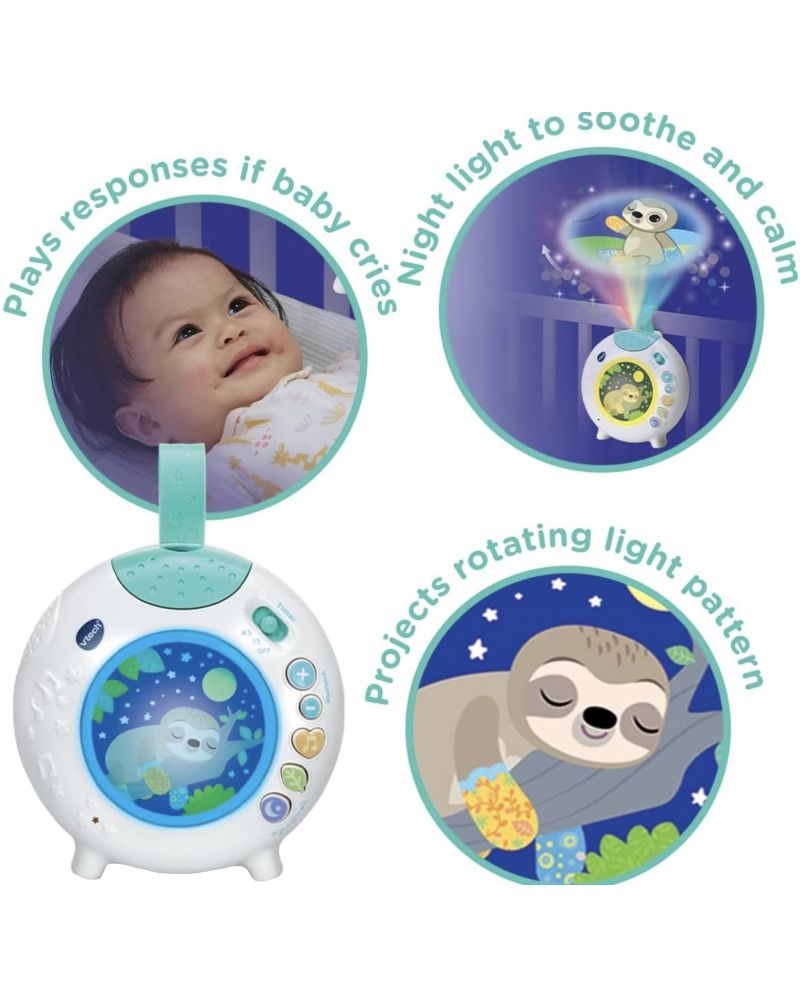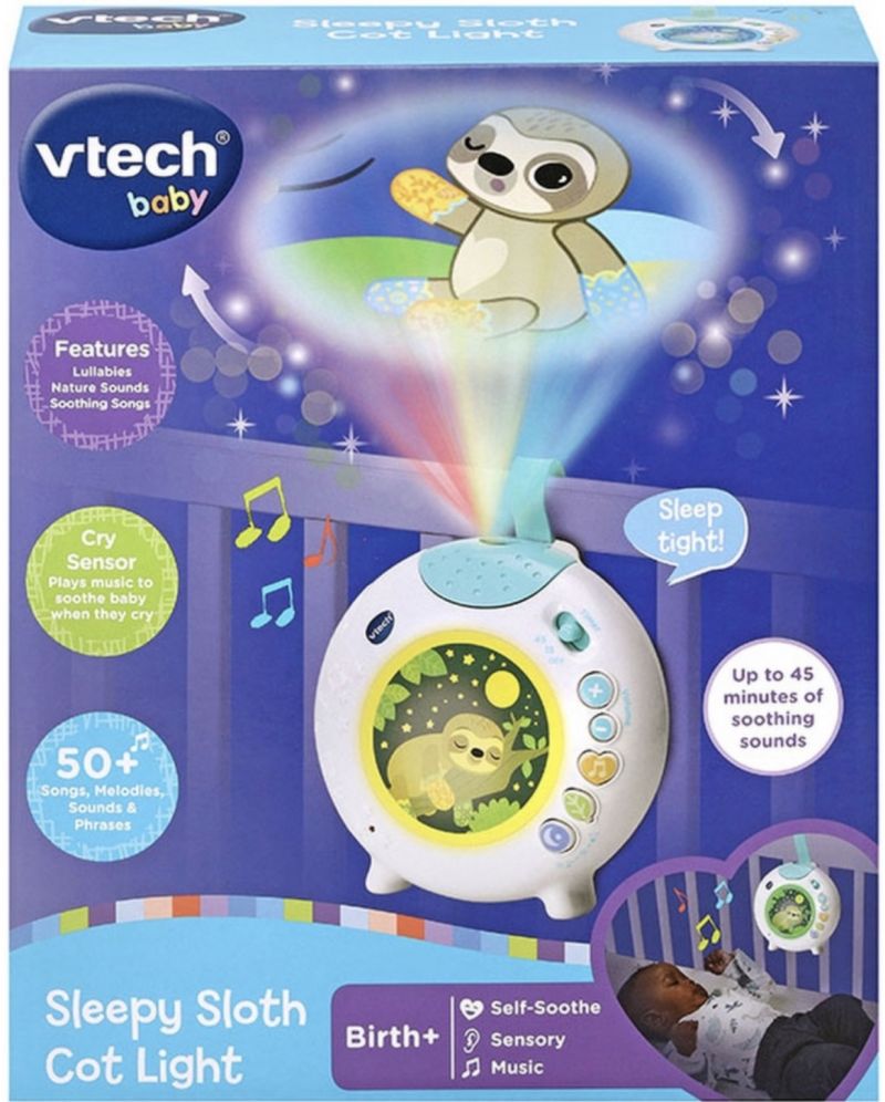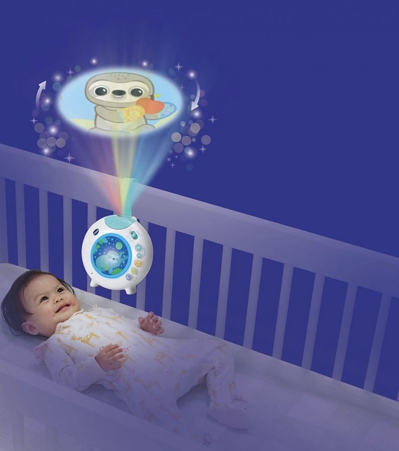 Лампата за детска кошара разполага с таймери за 15 и 45 минути, контрол за силата на звука и контролер за светлината, които управляват нощната лампа и въртящия се светлинен шаблон, проектиран на тавана. Симпатичният ленивец пее успокояващи песни, като проектира въртящ се светлинен шаблон на тавана. Вграденият сензор за звук автоматично възпроизвежда успокояващи отговори, ако бебето плаче.