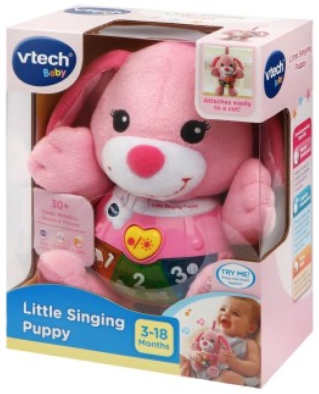 Кученцето ще изпълни 3 приспивни песни и 15 щастливи мелодии със забавни кучешки звукови ефекти, които са с образователна цел. Може да бъде прикрепено и към кошарата, детска количка или столче за кола.