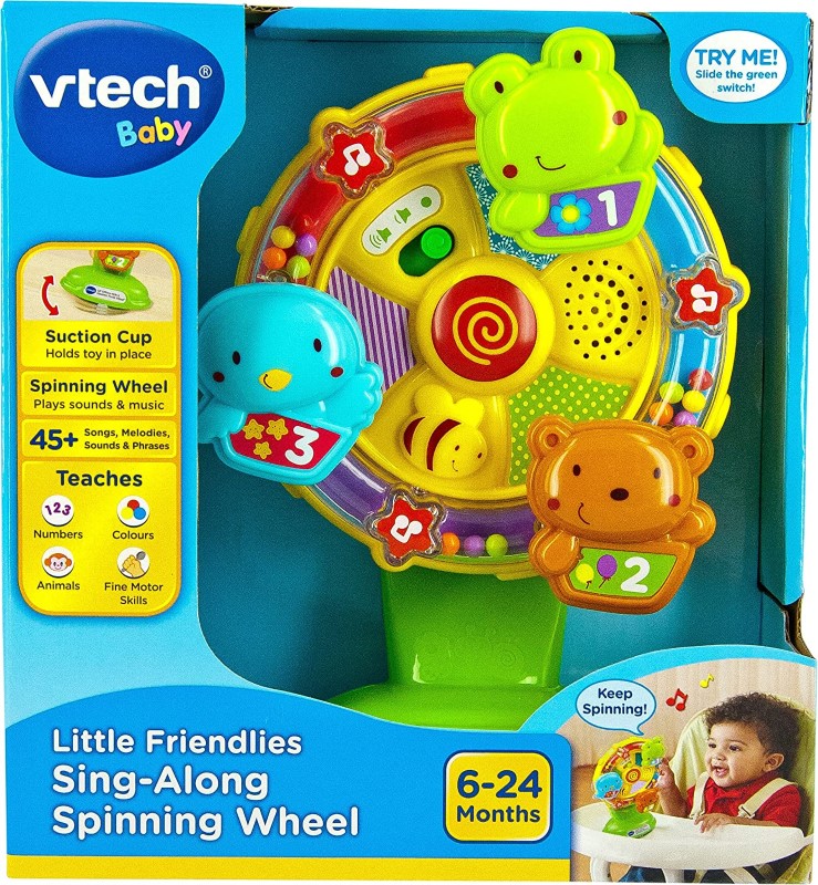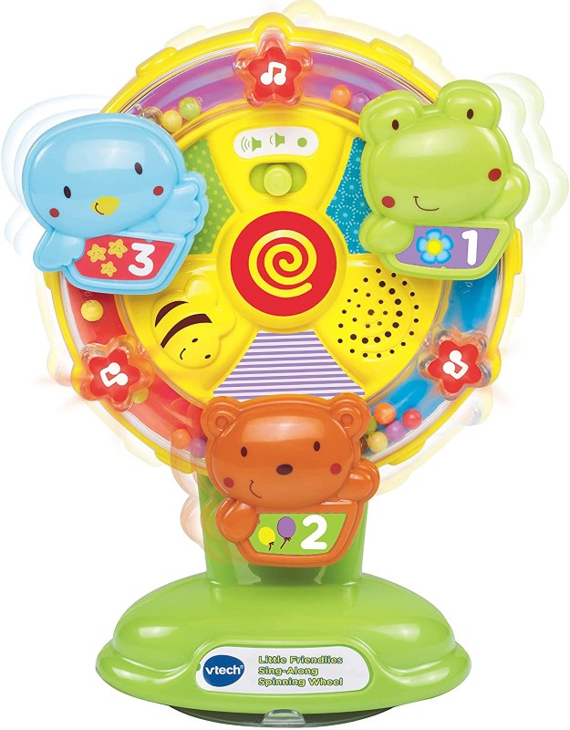 Цветна музикална играчка с весели животни, която има за цел да запознае мъниците с животните, числата и цветовете. Играчката включва мигащи светлини и забавни звукови ефекти – 10 нежни мелодии и 5 песнички за пеене. Бебето ви ще се забавлява, докато върти и натиска малките животни, научавайки техните имена, звуци и слушайки забавните им песнички. Животните ще ви запознаят и с различни цветове и предмети. Когато животните играят, завъртете колело, за да видите светлините във формата на звезди да мигат и да чуете забавни звукови ефекти. Въртенето на колело развива фините двигателни умения, докато мигащите светли осигуряват сензорна стимулация. Играчката е изцяло на английски език.