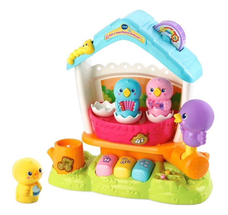 Къщичката включва три светещи бутона, с които децата учат предмети, 50 песнички, мелодии, звуци и фрази.