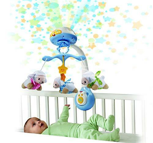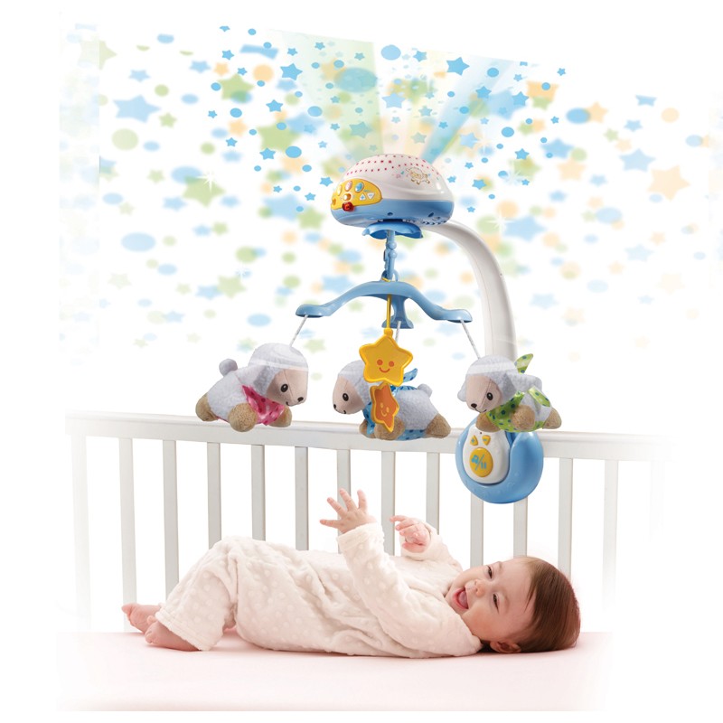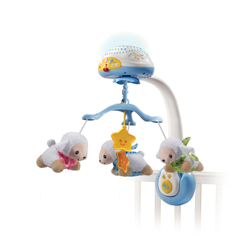 Музикална въртележка придружена с три меки въртящи се агънца и прожектор с 4 различни светлини, които ще допринесат за спокойния сън на вашето бебе. Въртележката има 4 приспивни песнички и 40 мелодии. Тя може да възпроизвежда звуци от природата и разполага с таймер, който може да се настрой за 5, 15 или 30 минути. С помощта на дистанционното управление, можете да промените силата на звука, да включвате или поставяте на пауза мелодиите, без да безпокоите детето. Звуков сензор се задейства при бебешки плач и възпроизвежда песни и звуци, за да го успокоят. За звуковите и светлинните ефекти са ви необходими 2 х АА и 3 х ААА батерии.