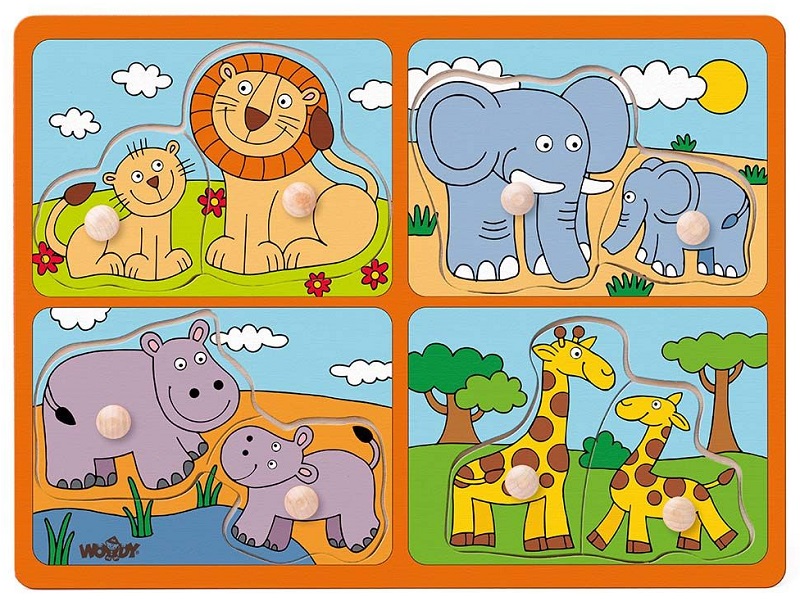 Дървен пъзел съдържащ 8 части, изобразяващ различни животни и техните малки, така децата ще се запознаят с лъва, слона, хипопотама и жирафа. Всяко парче е придружено с дръжка, която помага на децата лесно да ги вадят и поставят на правилното им място. Играта с пъзела развива въображението, ръчните умения, концентрацията и фината моторика на децата. Подходящ е и за игри в детски градини.