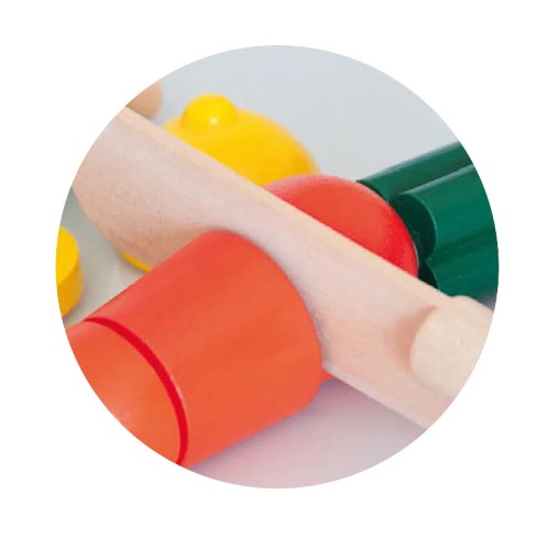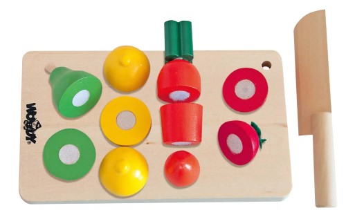 Комплектът се състои от дървена дъска, дървено ножче, домат, морков, круша и лимон. Между отделните части на всеки един от продуктите има залепващо покритие, което ще позволи на малките домакини многократно да режат плодовете и зеленчуците. комплектът не съдържа малки части и е подходящ и за игра от по – малки деца.