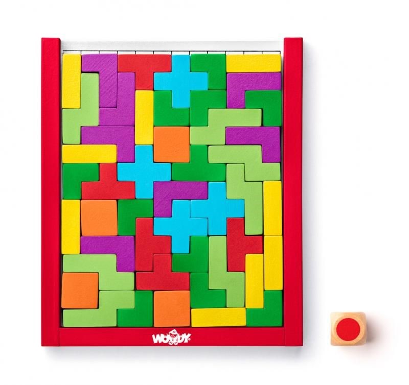 Образователна логическа игра на „Тетрис“, изработена от красиви дървени блокчета с много цветове.