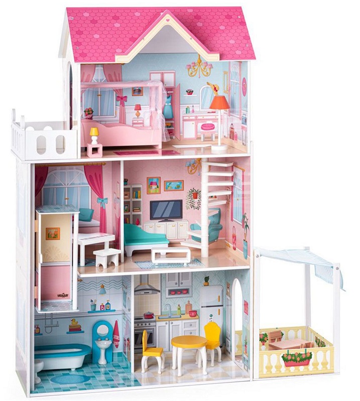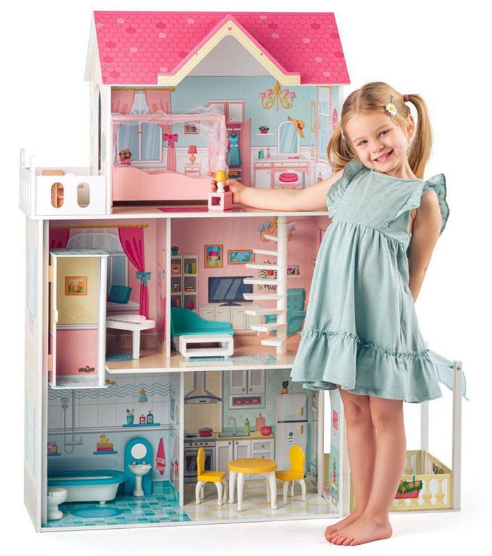 Дървената къща за кули Малибу ще очарова всяко момиченце с модерния си дизайн в розови нюанси и стилен интериор. Направена е с много вкус и изключително фини детайли, красиви елементи по терасите, прозорците и асансьора. Къщата е триетажна и разполага с пет стаи, стълба, движещ се асансьор, балкон и беседка.
