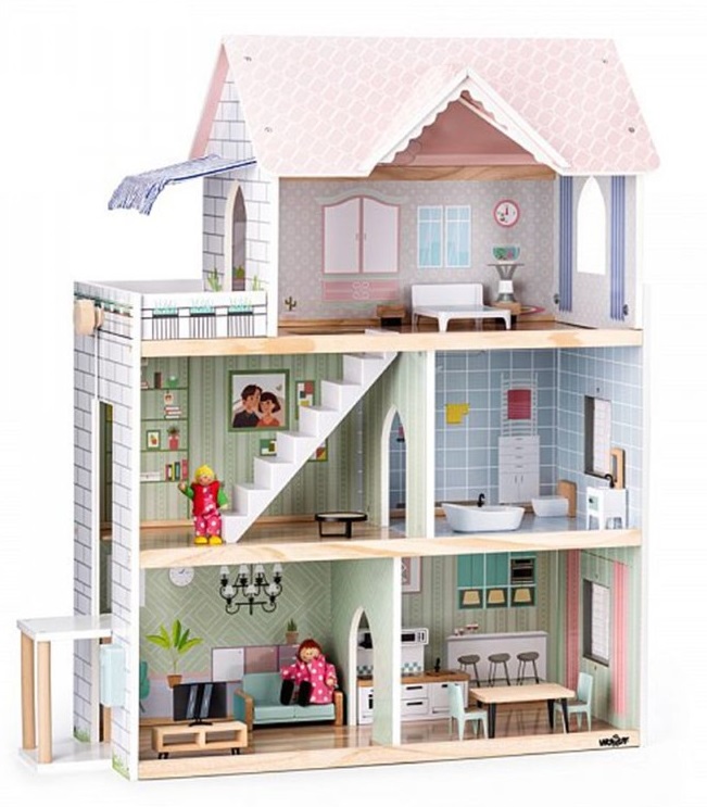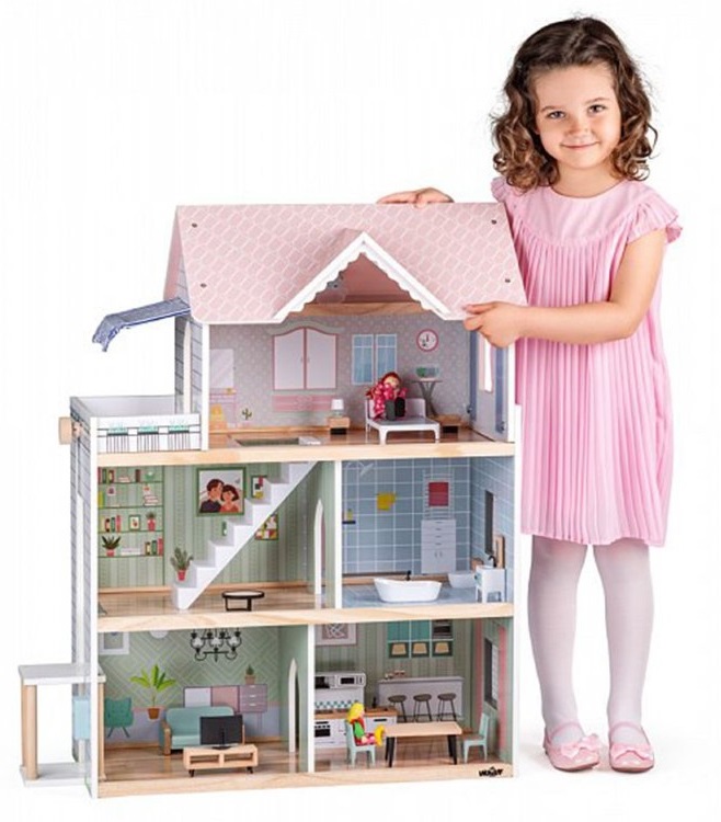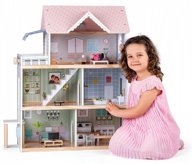 Просторна дървена триетажна къща за кукли с голяма тераса и обзаведени стаи. Направена е от високо качествени материали. Обзавеждането се състои от хол, спалня, кухня и баня, като мебелите са изработени от дърво. Всяко момиче мечтае за къща, в която да живеят любимите му кукли.