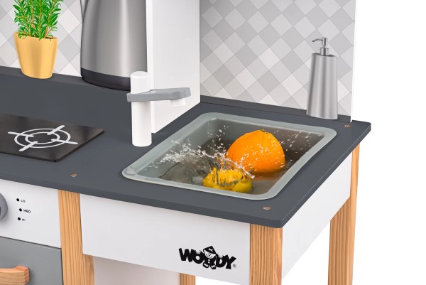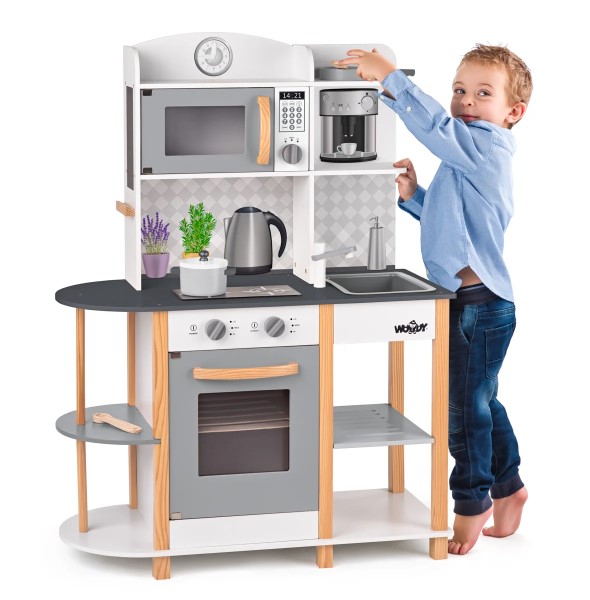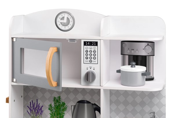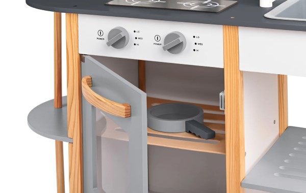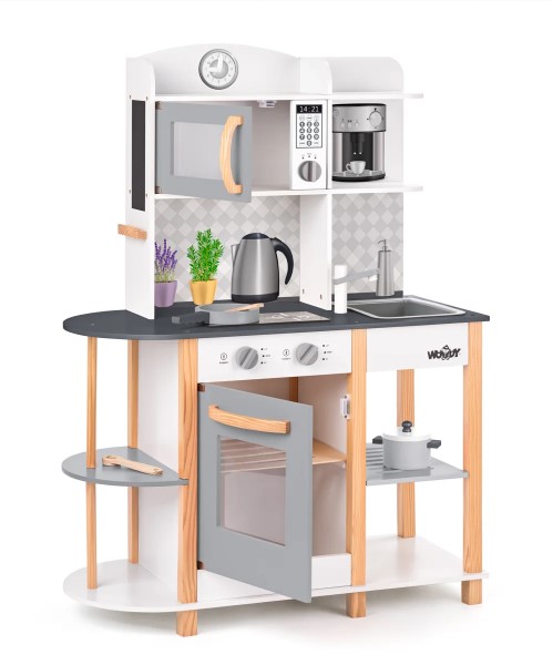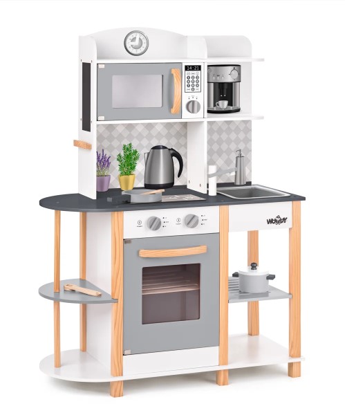 Дървена кухня за малки домакини. Разполага с фурна за печене, 2 котлона за готвене, микровълнова печка, мивка, рафтове за съхранение на съдове, както и дървен рафт за аксесоари. Кухнята е изработена от качествен шперплат и дърво. Подходяща е за игра и в детски градини.