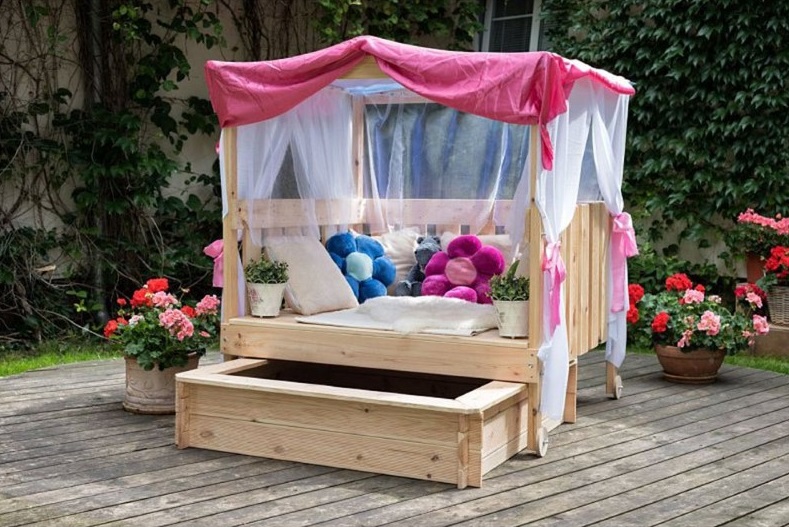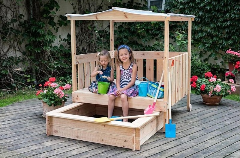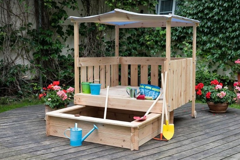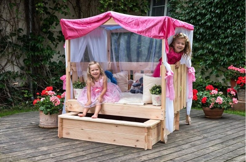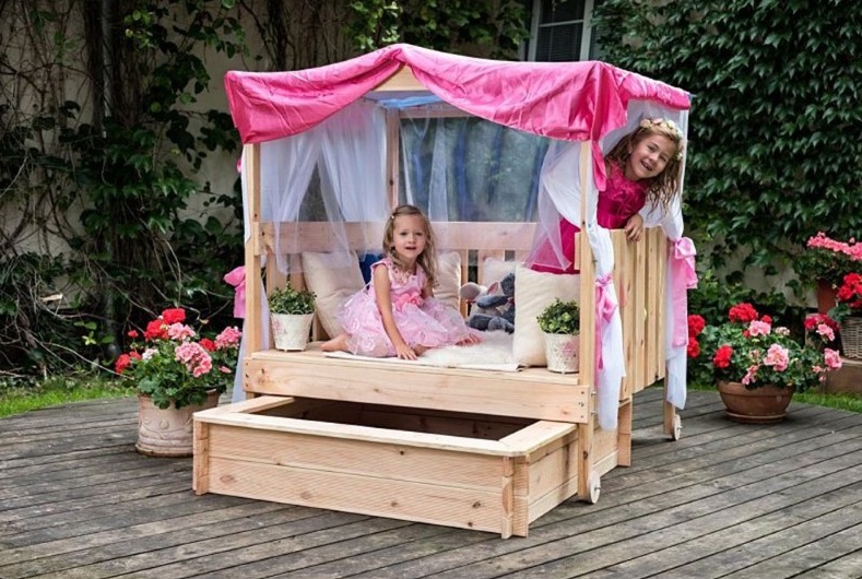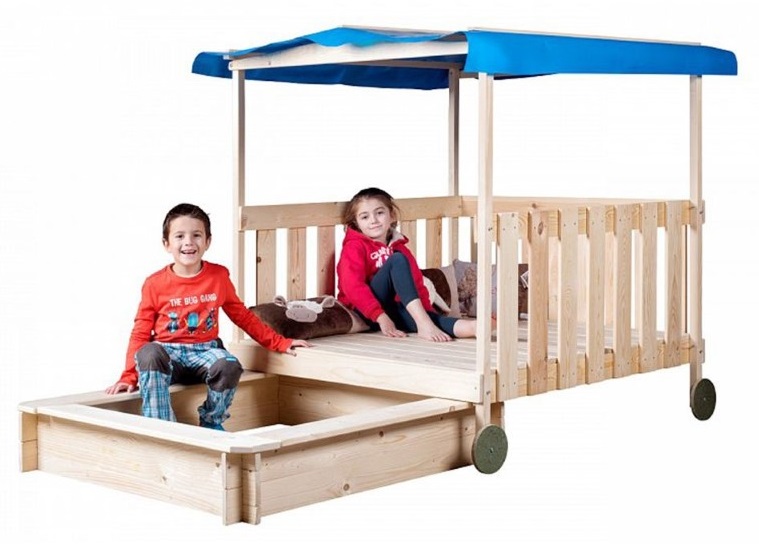 Децата ви ще могат да прекарат дните през лятната ваканция в игра и забавления. Тя е изцяло дървена, с колела и покрив. Под нея можете да скриете пясъчника, а когато на децата им се доиграе да го извадите, за да строят замъци от пясък.
