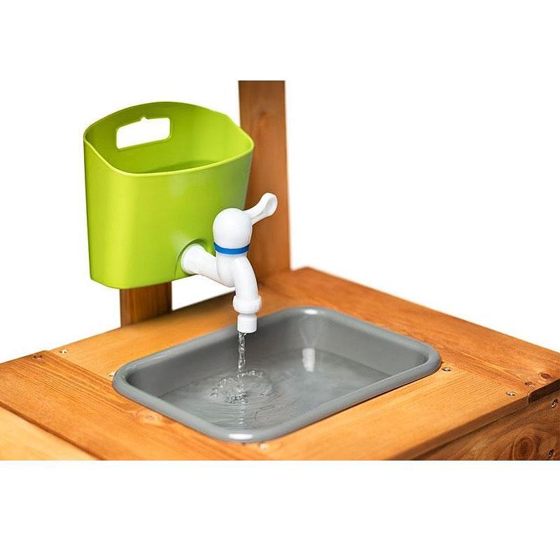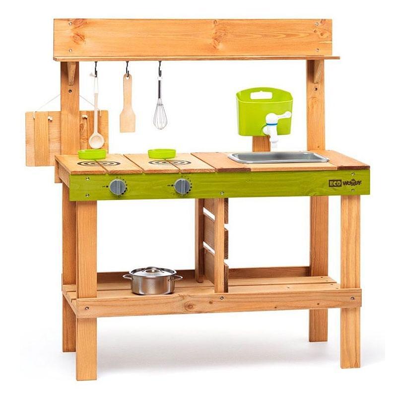 Кухнята разполага с готварски плот, мивка с резервоар за вода и нарисуван котлон. В долната част децата ще открият голямо свободно пространство, в което могат да съхраняват откъснати от градината плодове и зеленчуци. В комплекта са включени: 1 тенджера, лъжица, бъркалка. Като допълнение има и черна дъска за писане с тебешир, където детето може да записва рецепти или да запише менюто за деня.