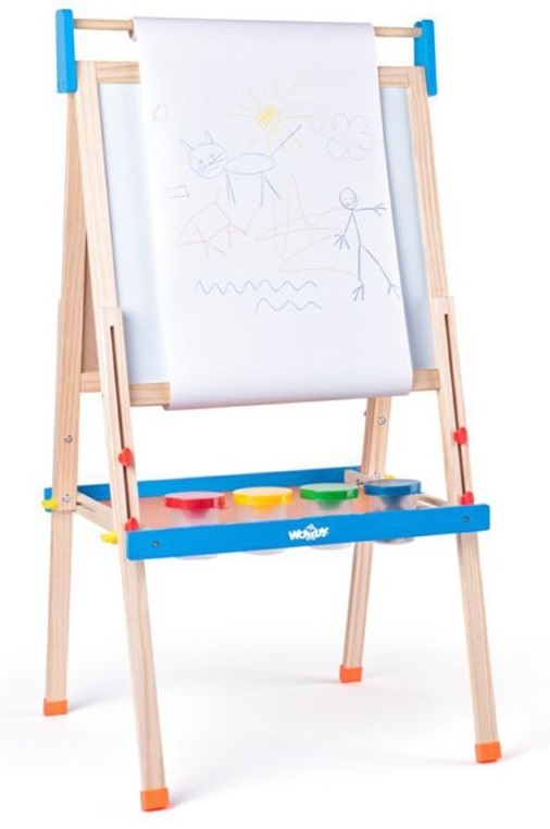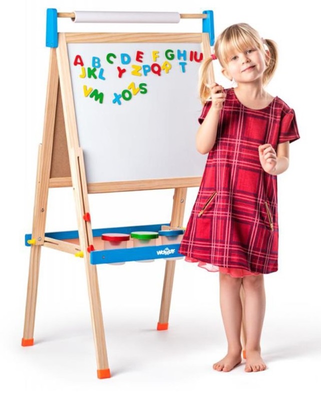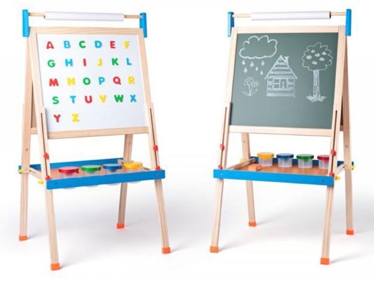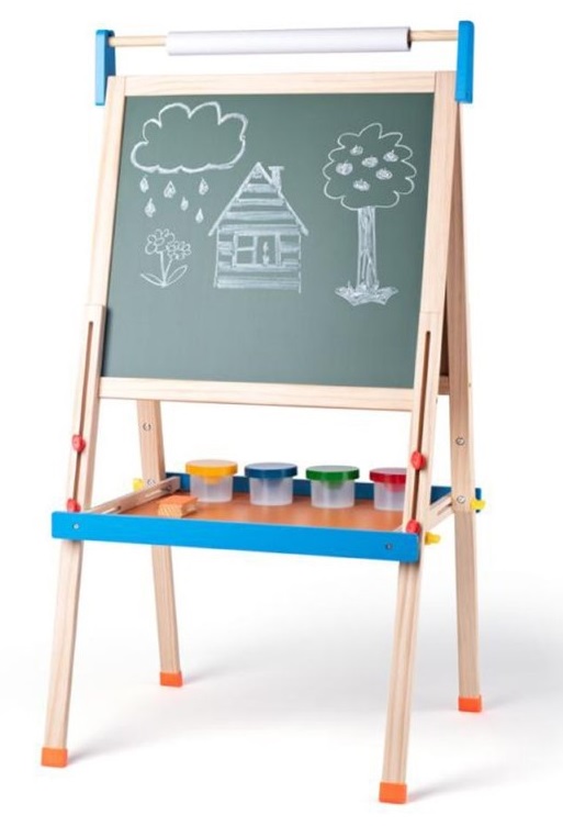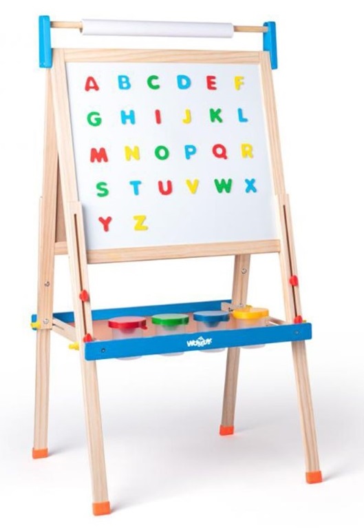 Дървена дъска с две лица – черна дъска за писане с тебешири и магнитна бяла дъска за писане и рисуване с маркери. Над статива, дъската има руло с хартия върху което също може да се пише и рисува. Отдолу има рафт, на който може да се слагат, тебеширите, гъбичката и флумастерите. В комплекта са включени и магнитни букви на английската азбука.