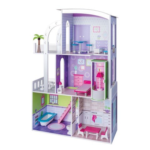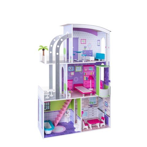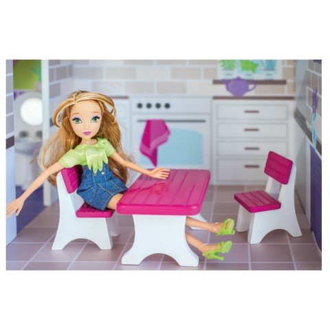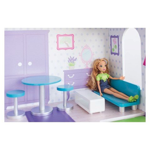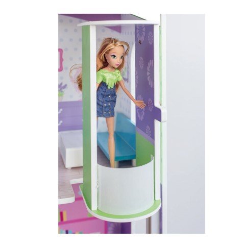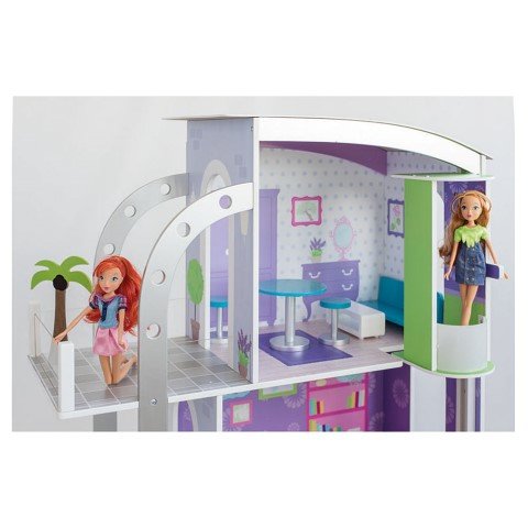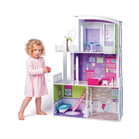 Тази триетажна къща е проектирана от работилницата на чешки дизайнери и е изработена от качествено дърво комбинирано с твърд талашит. Нейните изчистени линии, функционалност и елегантност се дължат на модерния и вид съчетан с меки цветове. Отвореното и пространство я прави лесно достъпна във всички стаи. Къщата е проектирана за кукли тип Барби (30 см). Всички стаи са обзаведени с мебели от масивна дървесина. В комплекта не са включени кукли! Къщата е подходяща за игра и в детски градини.