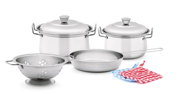 Всяка кухня се нуждае от готварски комплект със съдове за готвене, с които бъдещите готвачи да направят чудесни ястия за семейството си. Този комплект от Woody е идеално допълнение към всяка детска кухня. Той се състои от малка и голяма тенджера с капак, тиган, гевгир и две текстилни ръкохватки. Съдовете са изработени от метал и стъкло, като са с диаметър ф-10.