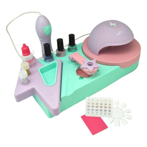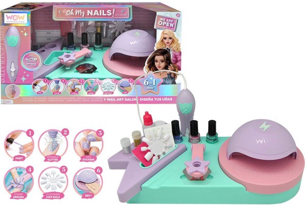 Студиото за нокти разполага с лампа за сушене на лак, магически молив за декориране на ноктите с блясък, щампи за декориране на ноктите с фигури и рисунки, пила за нокти за маникюр, цветен лак, така че малката дама да се чувства като един истински маникюрист, който ще постигне невероятни резултати с това творческо студио за маникюр.